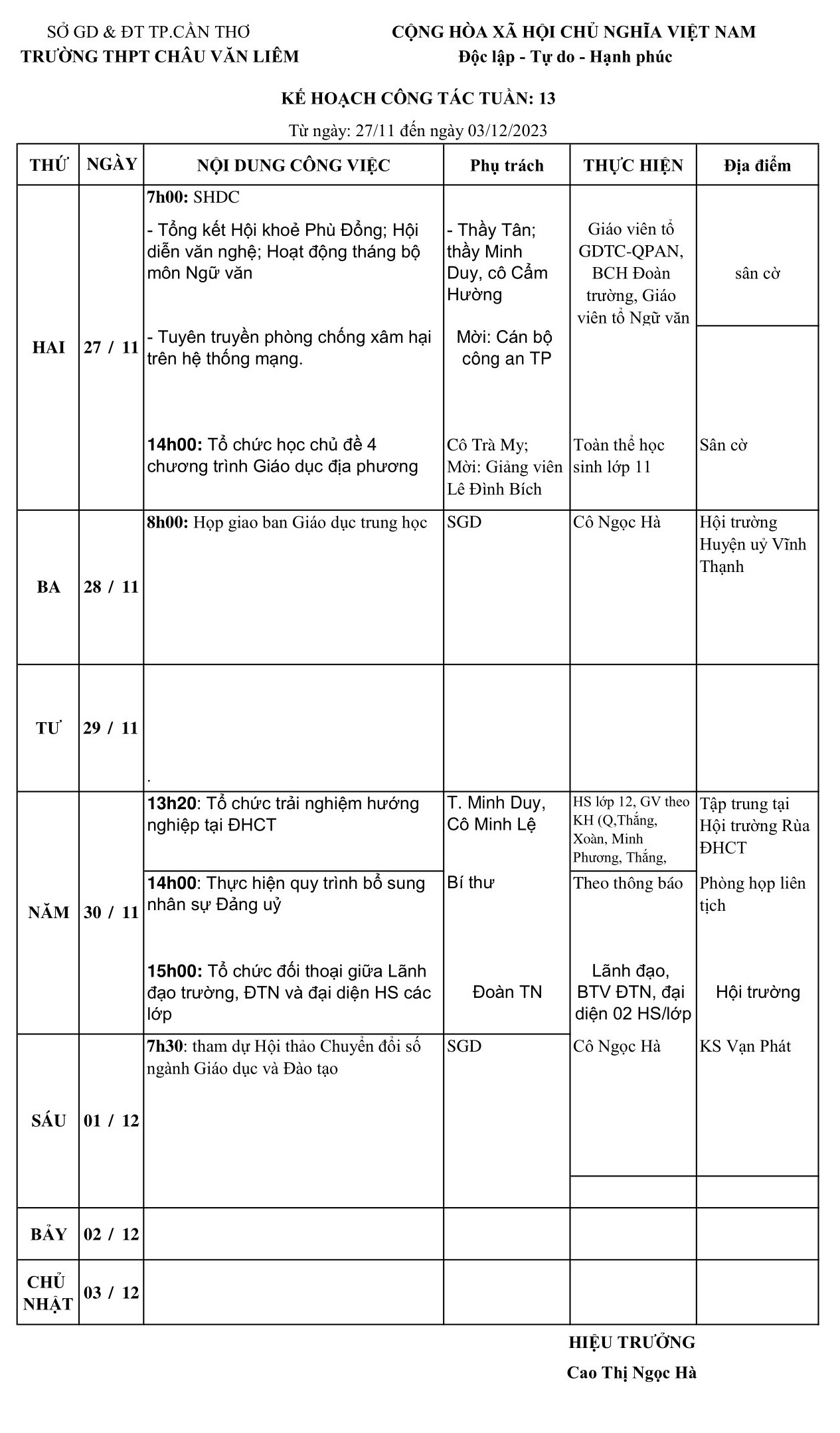 KẾ HOẠCH CÔNG TÁC TUẦN: 13
