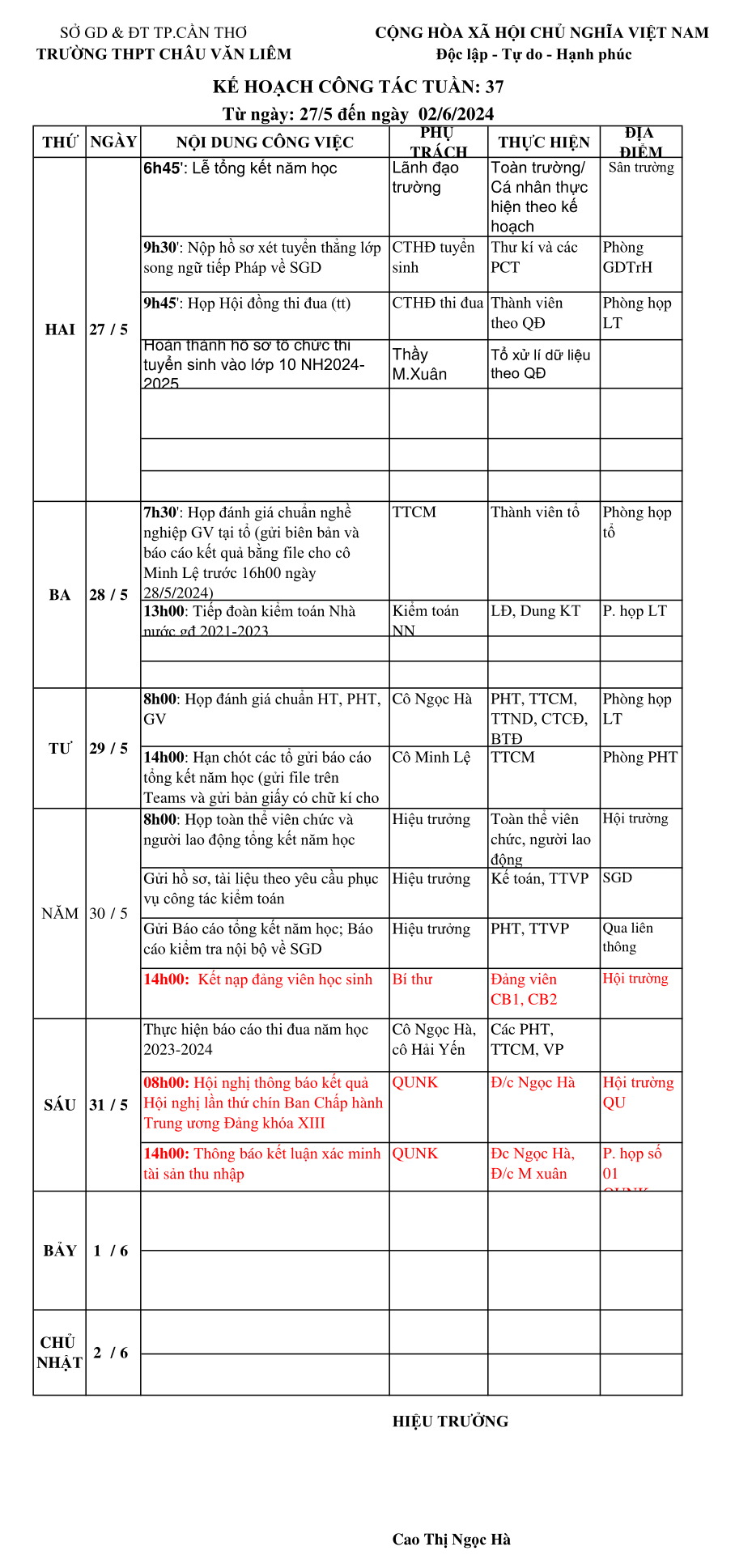 KẾ HOẠCH CÔNG TÁC TUẦN: 37
