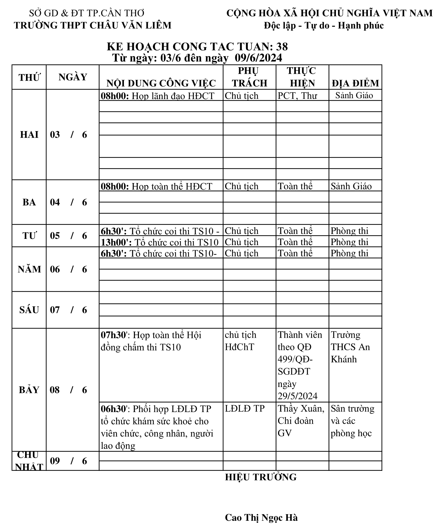 KẾ HOẠCH CÔNG TÁC TUẦN: 38