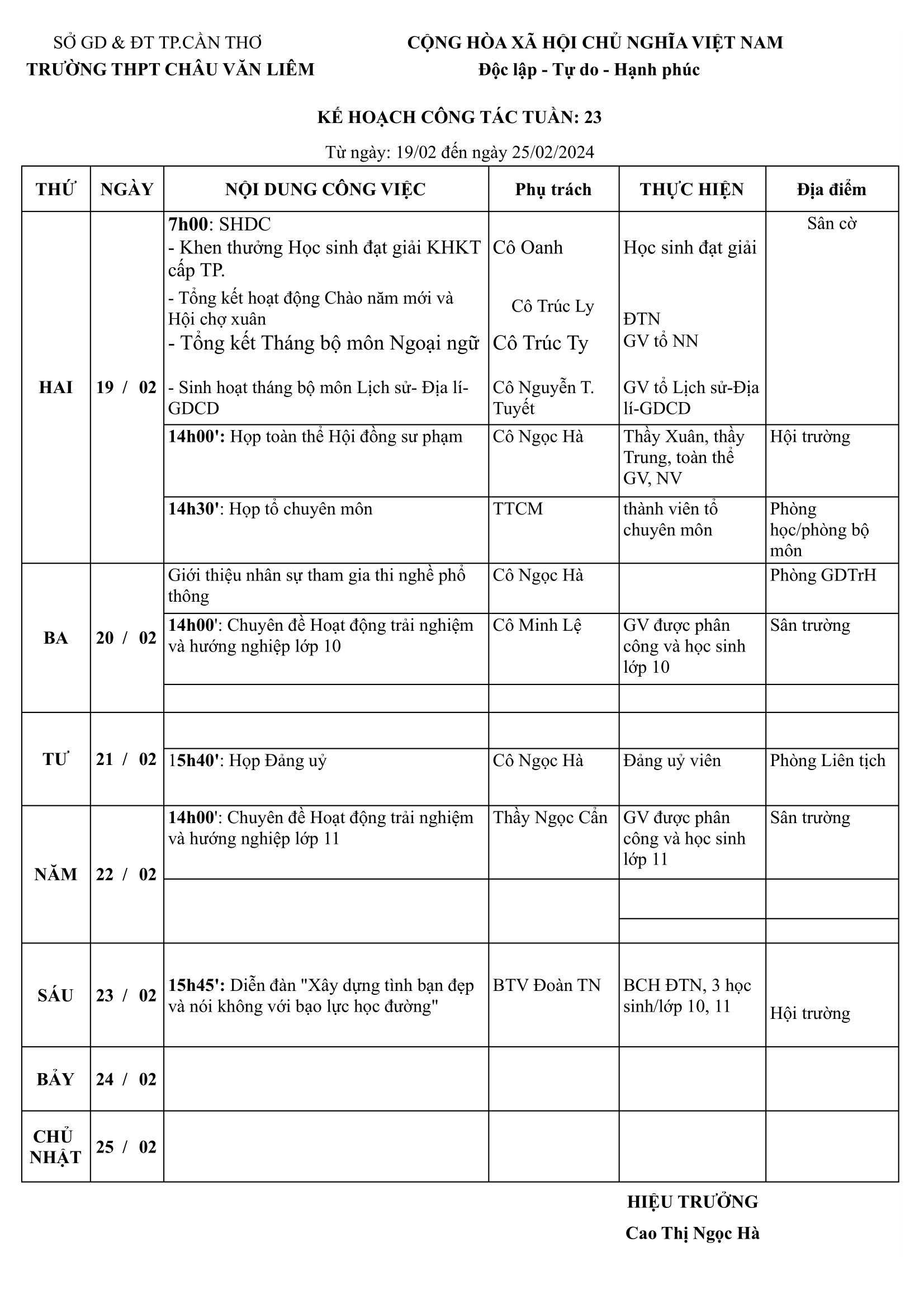 KẾ HOẠCH CÔNG TÁC TUẦN: 23