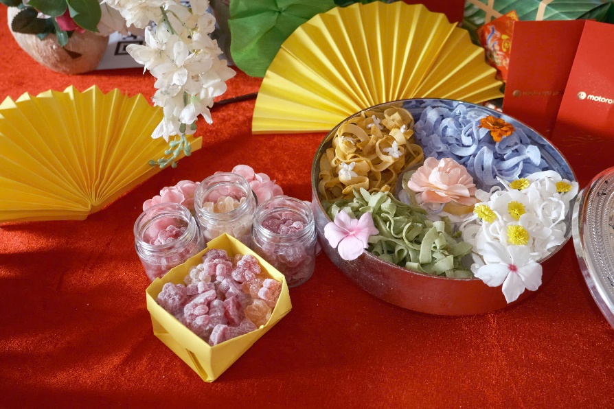Những bông hoa sen, hoa hồng, hoa cúc được tạo nên từ vỏ bắp khô không chỉ đẹp mắt mà còn thể hiện rõ tinh thần tái chế, bảo vệ môi trường. Các sản phẩm mứt Tết mang hương vị truyền thống như mứt dừa, mứt gừng, mứt hạt sen… được chế biến với màu sắc tự nhiên từ lá dứa, gấc, hoa đậu biếc… vừa an toàn vừa hấp dẫn. Bên cạnh đó, những viên kẹo vitamin nhiều màu sắc từ trái cây và rau củ không chỉ đẹp mà còn giàu giá trị dinh dưỡng, thể hiện sự hiểu biết của học sinh về vai trò của vitamin đối với sức khỏe.